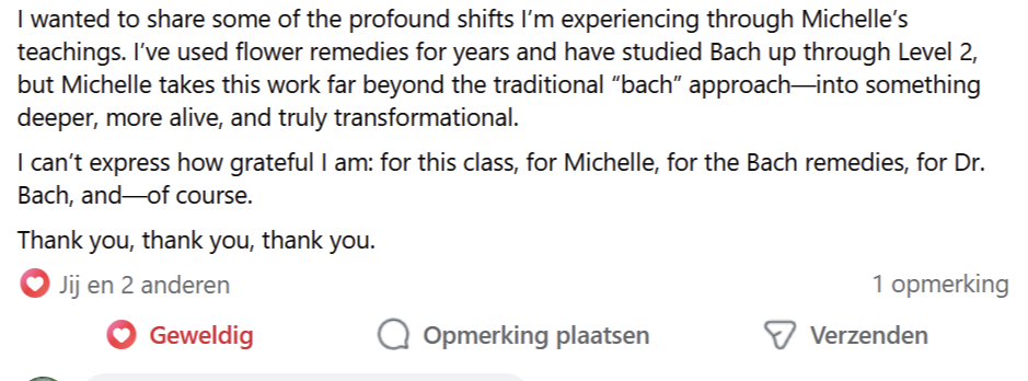 But life had other plans. During my studies at the European Academy for Natural Healthcare in Maastricht, I was introduced to the Bach Flower Remedies. That’s also where I met my nature therapist, a woman who would walk beside me in a way no one ever had. I began to study the remedies... and also experience them, deeply, as a client. And then, everything changed.
