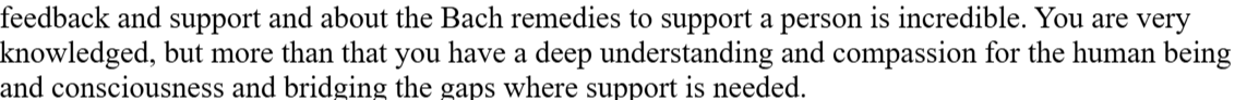 "I had no idea Bach Flowers could help heal such deep wounds, and learning that I could create my own personalized remedy under her guidance was eye-opening".